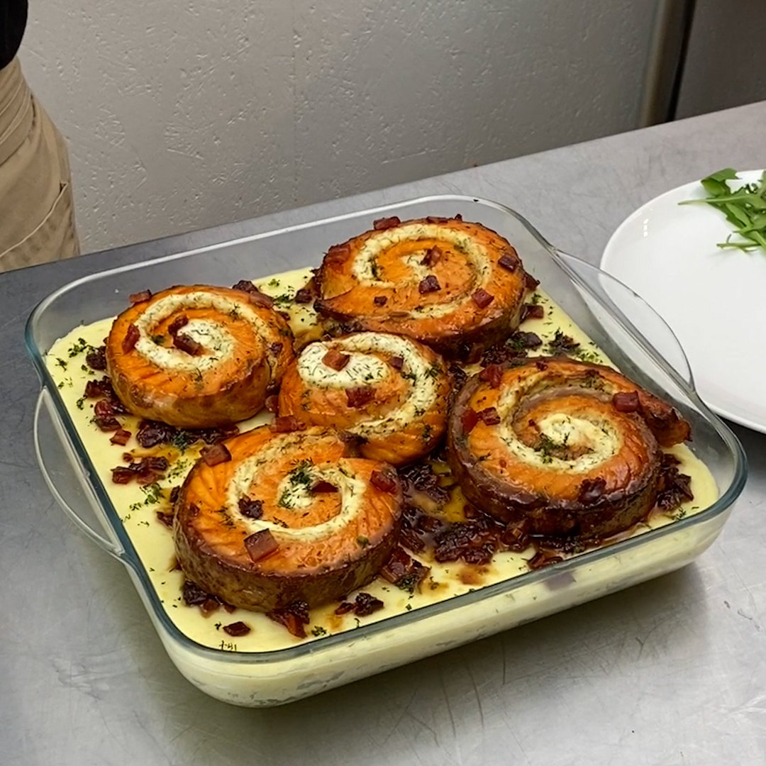 Zum RezeptSo einfach und so köstlich! Leckeres Kartoffelpüree mit frischem Lachs, getoppt mit karamellisiertem Bacon ergibt das perfekte Feiertags-Menü.