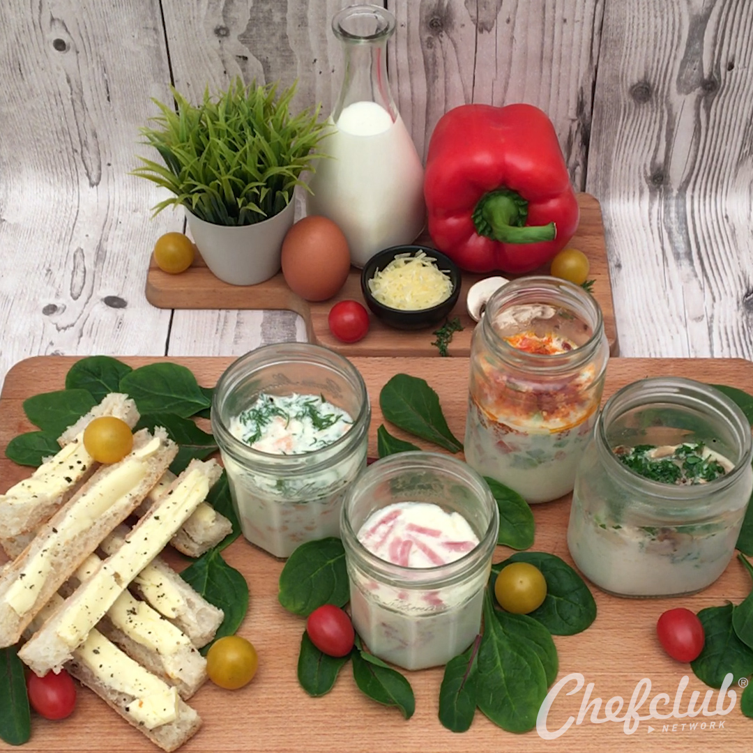 Eine hübsche Idee für den Sonntagsbrunch: Gekochte Eier im Glas mit Lachs, Champignons oder Käse gefällig?