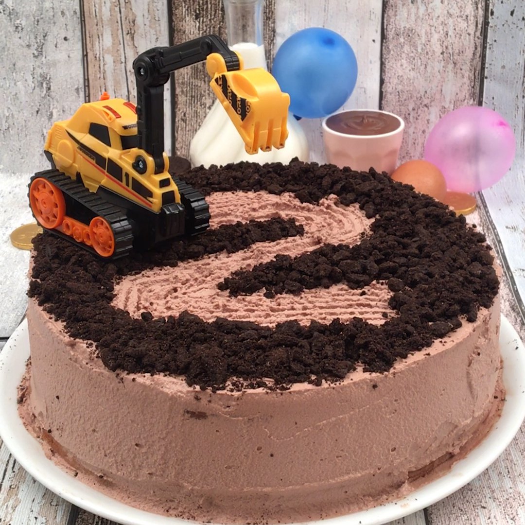Mit großen, schweren und kraftvollen Maschinen auf losem Grund schaufeln und baggern, das geht auch auf unserem Schokokuchen. Einmal platt machen bitte!