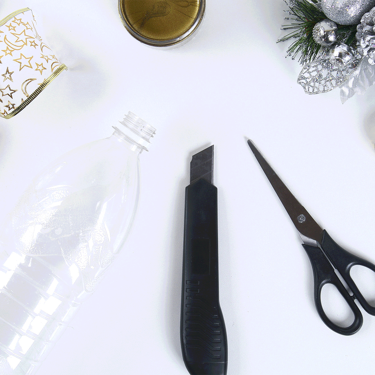 Schneiden Sie den Kopf einer Einwegflasche ab, hüllen ihn in Goldpapier und befestigen das Papier im Flascheninneren. Knoten Sie ein schöne Schleife um den Hals und setzen Sie ins Innere eine kleine Goldkugel (zum Beispiel eine vom Weihnachtsbaum, oder wieso nicht ein Rocher?).