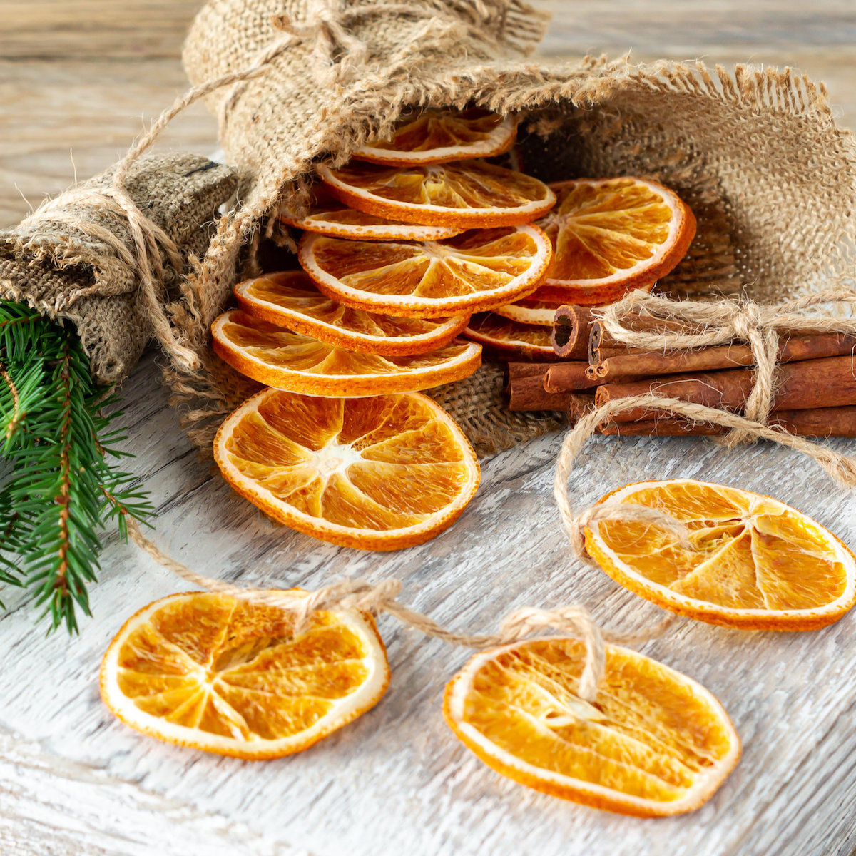 Schneiden Sie Orangen und Mandarinen in feine Scheiben und geben Sie sie auf Backpapier für 2 Stunden bei 90°C in den Ofen. Wenden Sie sie nach 1 Stunde. Sobald die Scheiben gut getrocknet sind, können Sie die Scheiben mit Nadel und Faden zu einer Girlande verbinden und beispielsweise den Weihnachtsbaum damit schmücken.