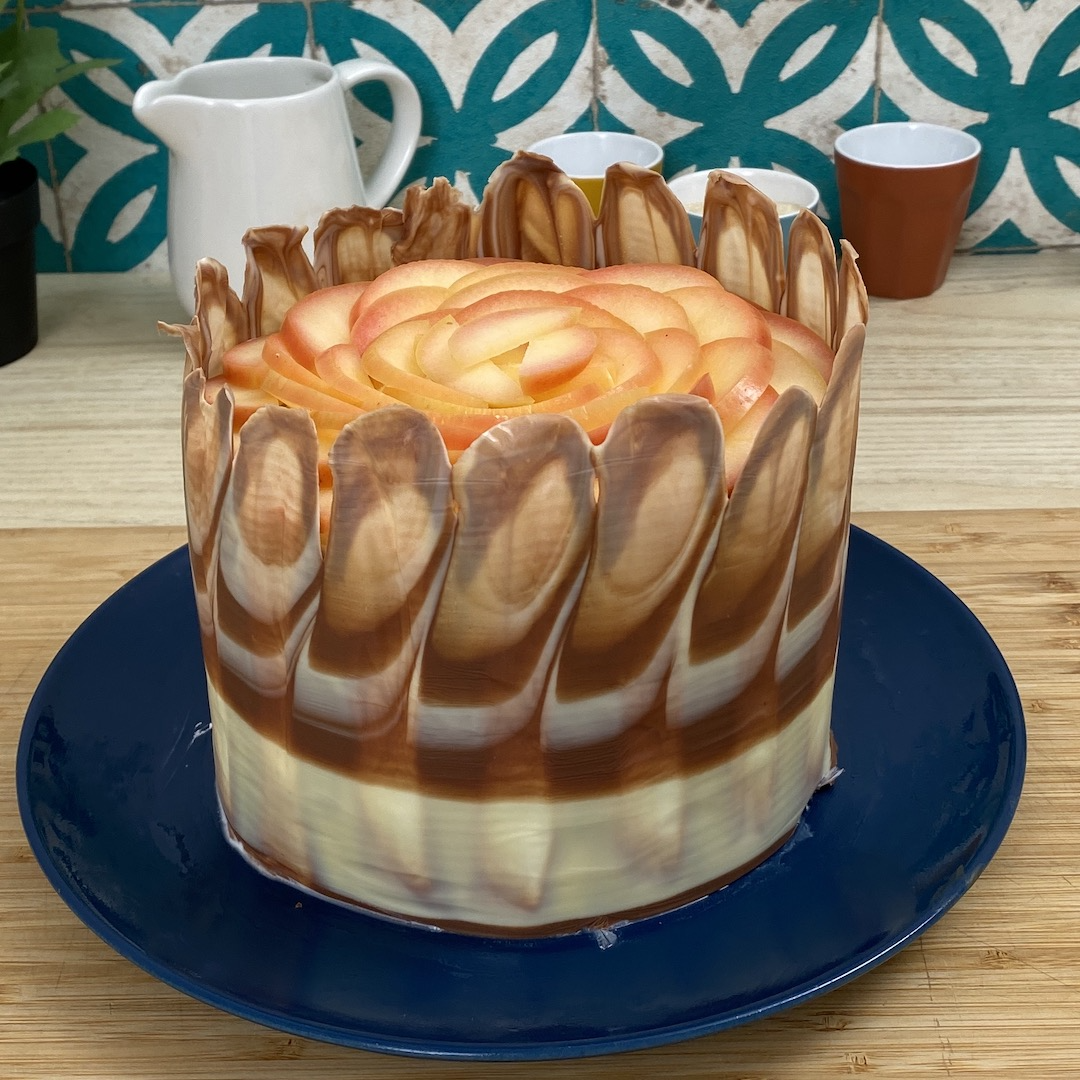 Check out the recipe!For the chocolate lovers out there, this rich, fluffy, fall-y chocolate cake is sure to please. Hidden inside the cake are whipped cream with a hint of vanilla bean and sweet caramelized apple. It’s frosted with more whipped cream and finished with a gorgeous layer of white and milk chocolate.