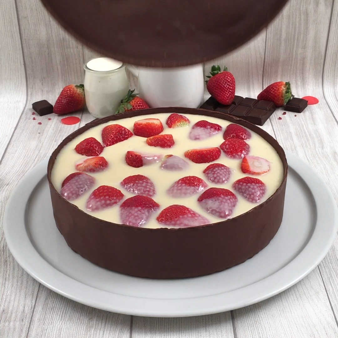 Receta baja en calorías! Esta tarta de fresa con chocolate y copos de cereal es perfecta para refrescantes meriendas.