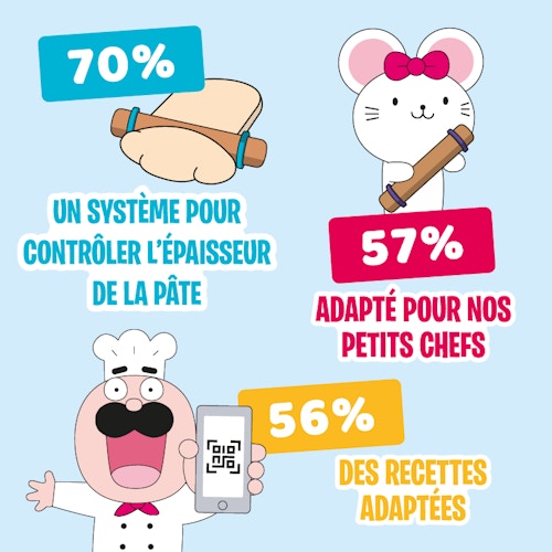 Pour répondre au mieux aux attentes de vos petits chefs, nous avons conçu le rouleau en respectant 3 de vos principaux critères : un système pour contrôler l’épaisseur de la pâte, une forme et une taille adaptées aux enfants et, pour finir, des recettes pour des pâtes qui épatent !