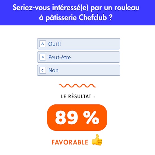 Un grand merci pour votre participation : 89% d'entre vous êtes partants pour un rouleau à pâtisserie Chefclub... Vous le voulez, nous le créons 🙌