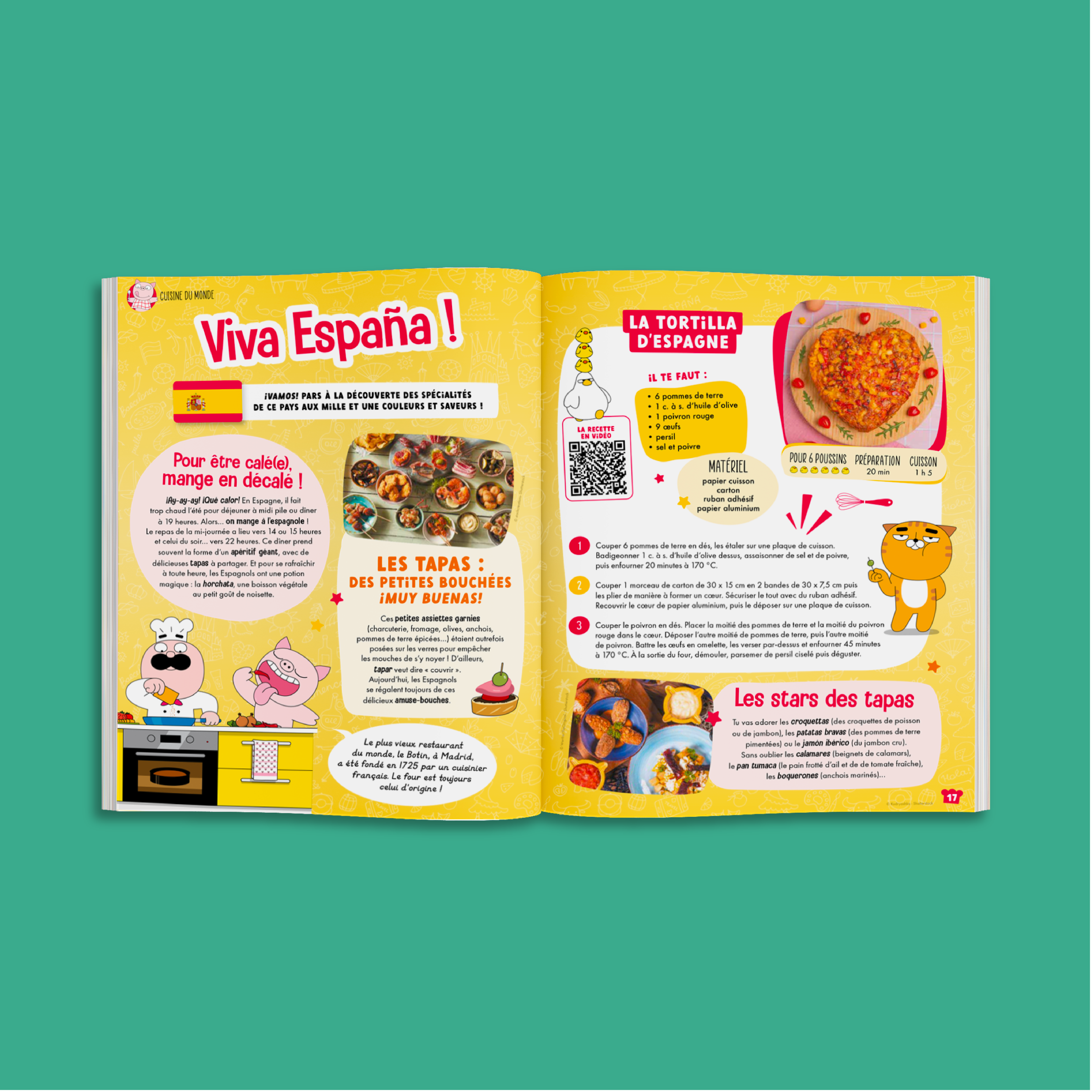 Je découvre la recette !La collection intègre 15 recettes Chefclub pour apprendre à cuisiner les fruits et légumes de saison. L’aventure sera également rythmée par des mini-jeux éducatifs et des devinettes pour en apprendre encore plus sur la saison. Mais aussi une expédition à la découverte des trésors culinaires et culturels d’un pays ! Dans ce premier numéro, partez à la découverte de l'Espagne !