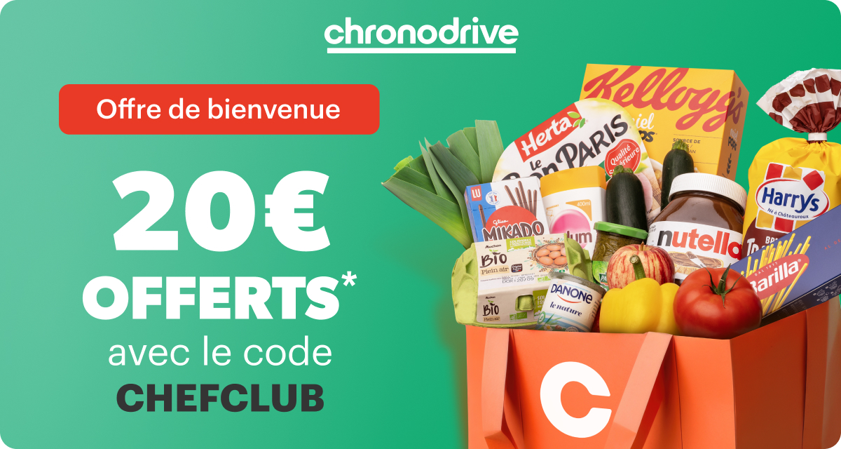 Profitez de l'offre de bienvenue sur votre première commande chez Chrondrive avec 20€ offerts sur vos courses dès 50€ d’achat avec le code CHEFCLUB !