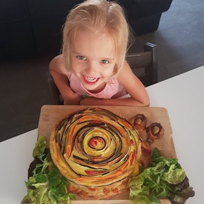 Ma petite kiiiiisinière Candice, 3 ans et demi qui a adoré pétrir la pâte, l'étaler, et mélanger les oeufs à la crème !!