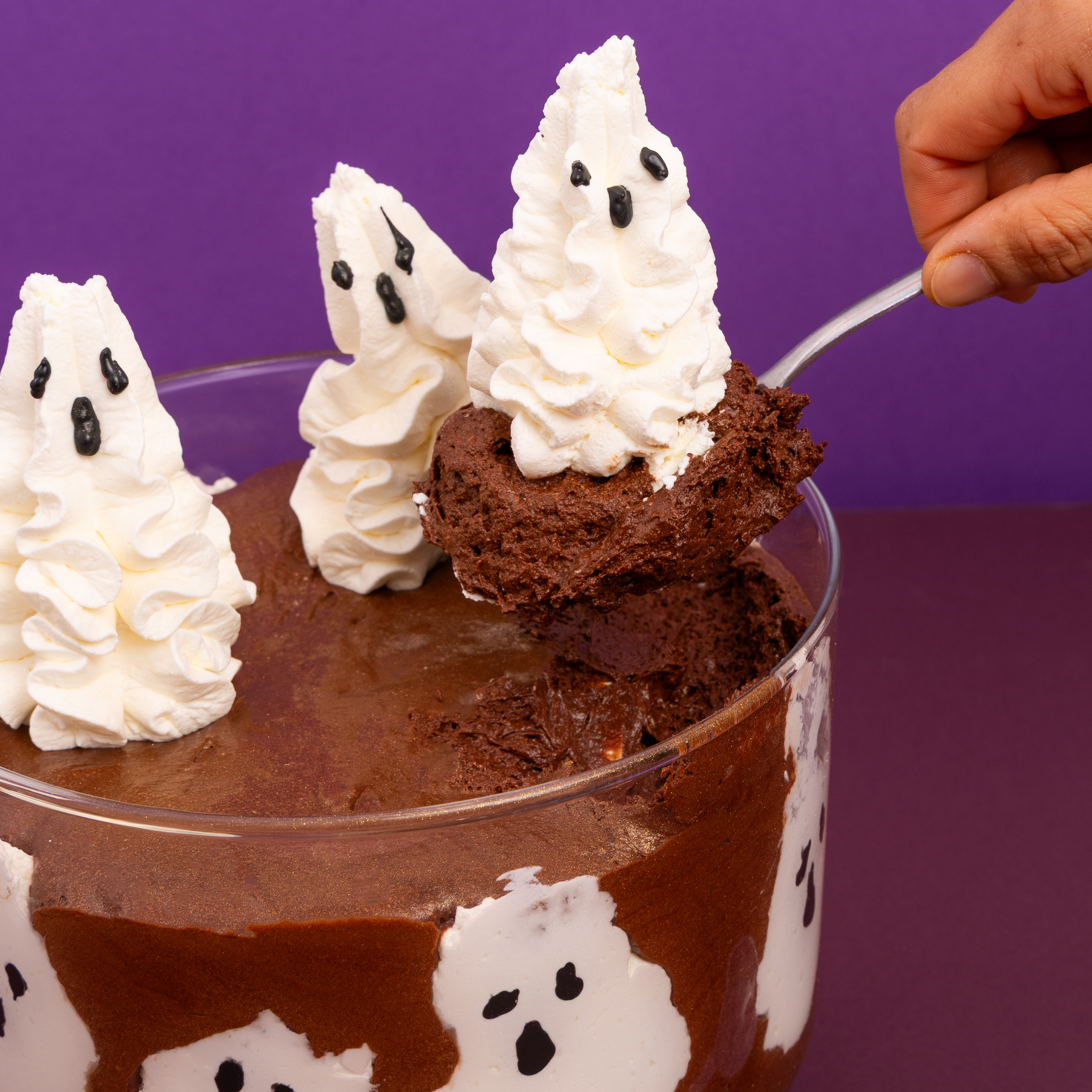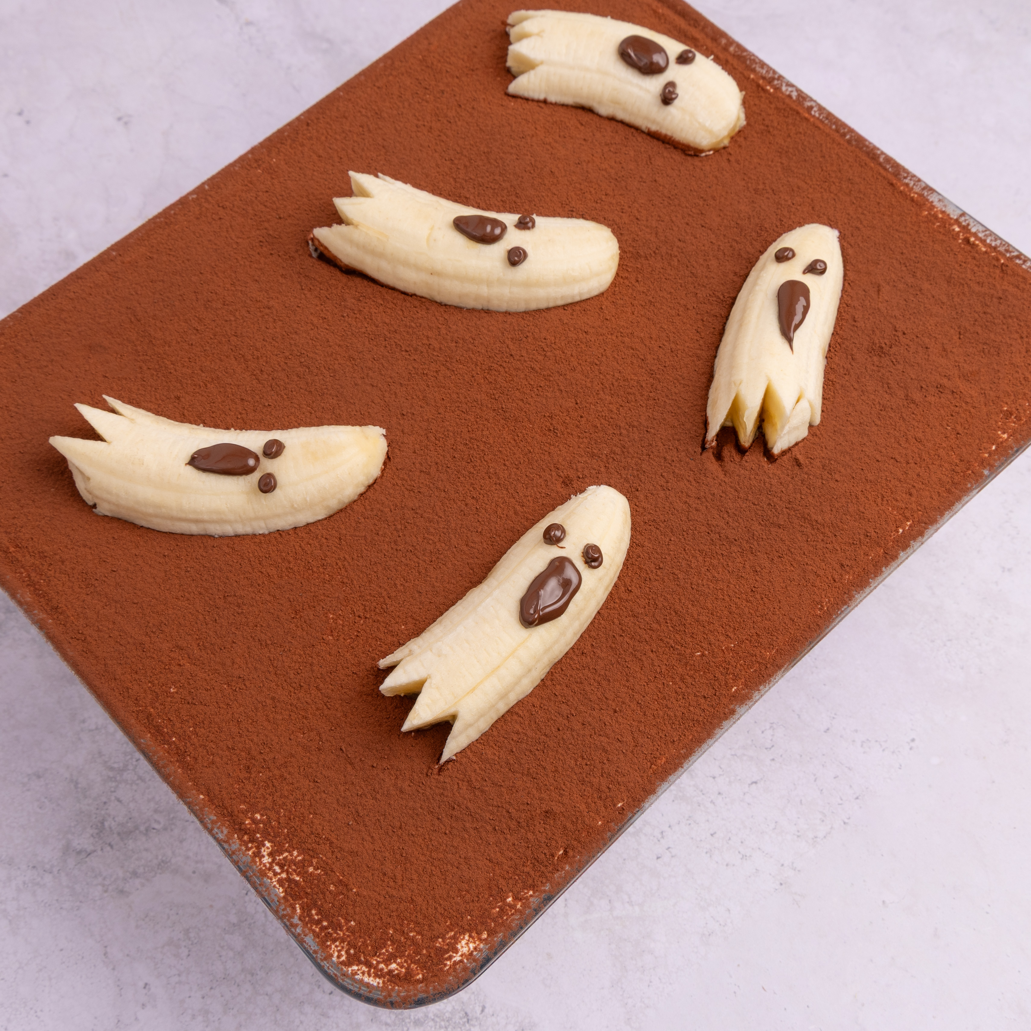Les fantômes ont trouvé un nouveau terrain de jeu… le vôtre ! Sous la poudre de cacao, les bananes se transforment en petits esprits curieux, flottant au-dessus d’un lit de caramel et de chantilly. Un dessert tout en douceur, mais attention : une seule bouchée et vous serez hanté par l’envie d’y retourner.