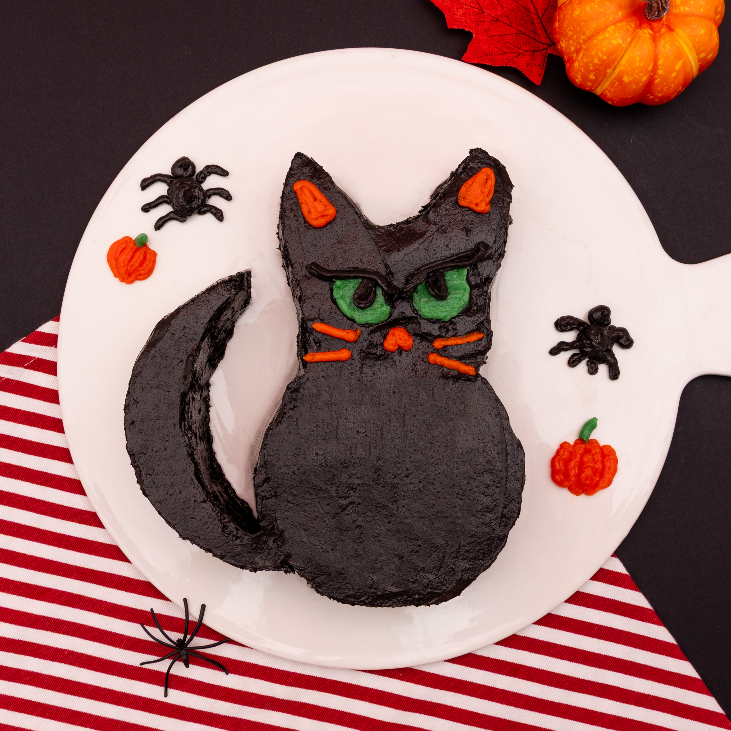 Je tremble de peur !Le chat noir est de sortie… et il a élu domicile dans votre cuisine ! Son regard vert perçant semble surveiller chaque geste, mais pas de panique : derrière son air mystérieux se cache un cœur moelleux au chocolat. Un peu de malice, une touche de magie, et ce gâteau deviendra le gardien officiel de votre table d’Halloween.