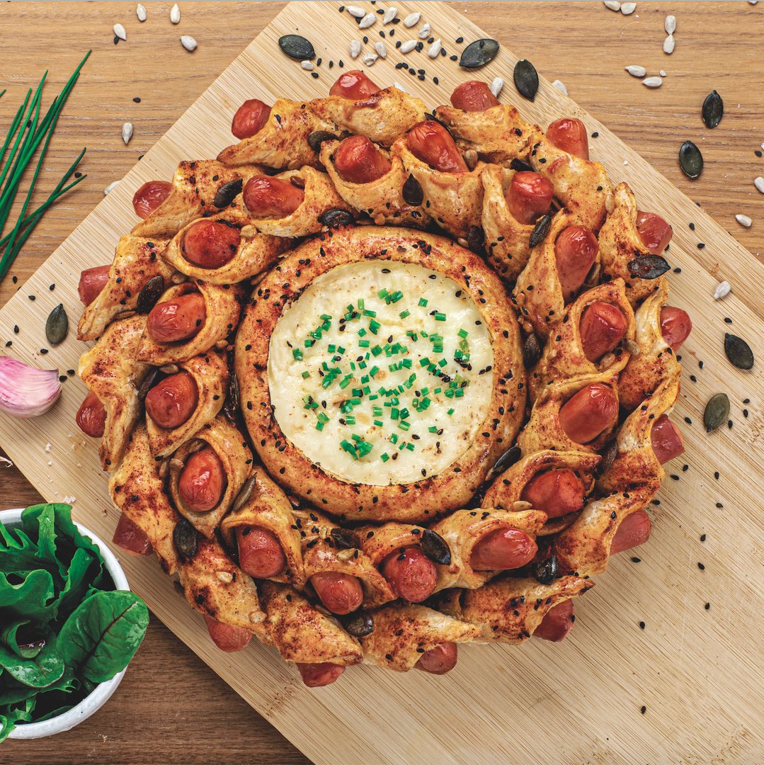Je découvre la recetteLe soleil rayonne même en hiver grâce à cette couronne apéritive de mini-saucisses et de fromage pour un apéro avec ses Little Darlings.