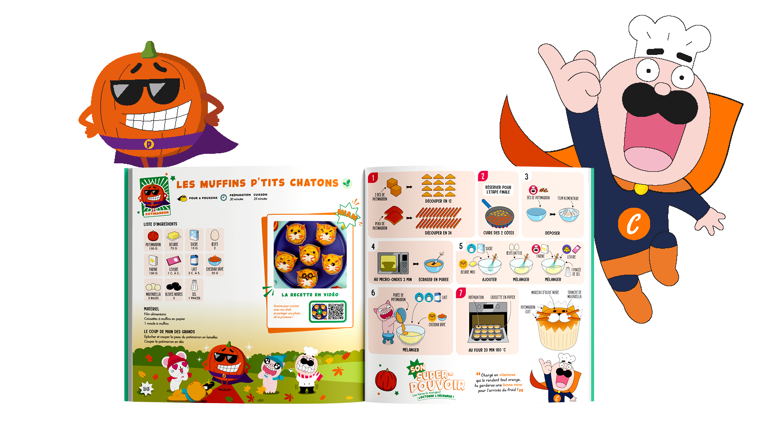 Retrouvez les aventures des Super-Héros de l’automne dans notre livre de cuisine pensé pour les enfants, avec 25 recettes (ré)créatives dessinées pas-à-pas à réaliser avec les tasses doseuses.