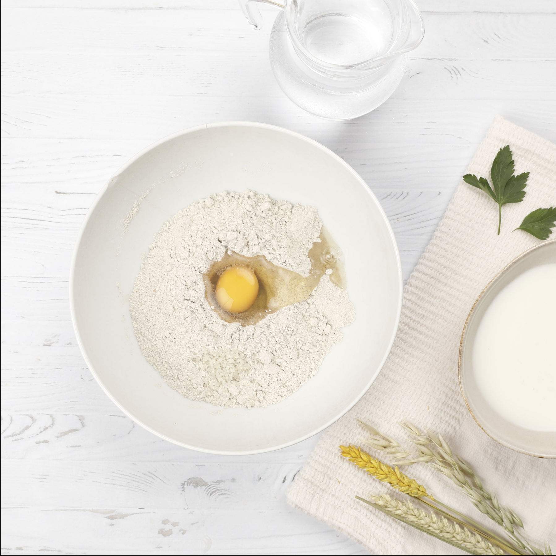 Déposer 250 g de farine de sarrasin, 1 cuillère à café de gros sel, former un puits puis déposer l’œuf dans l’espace au centre.