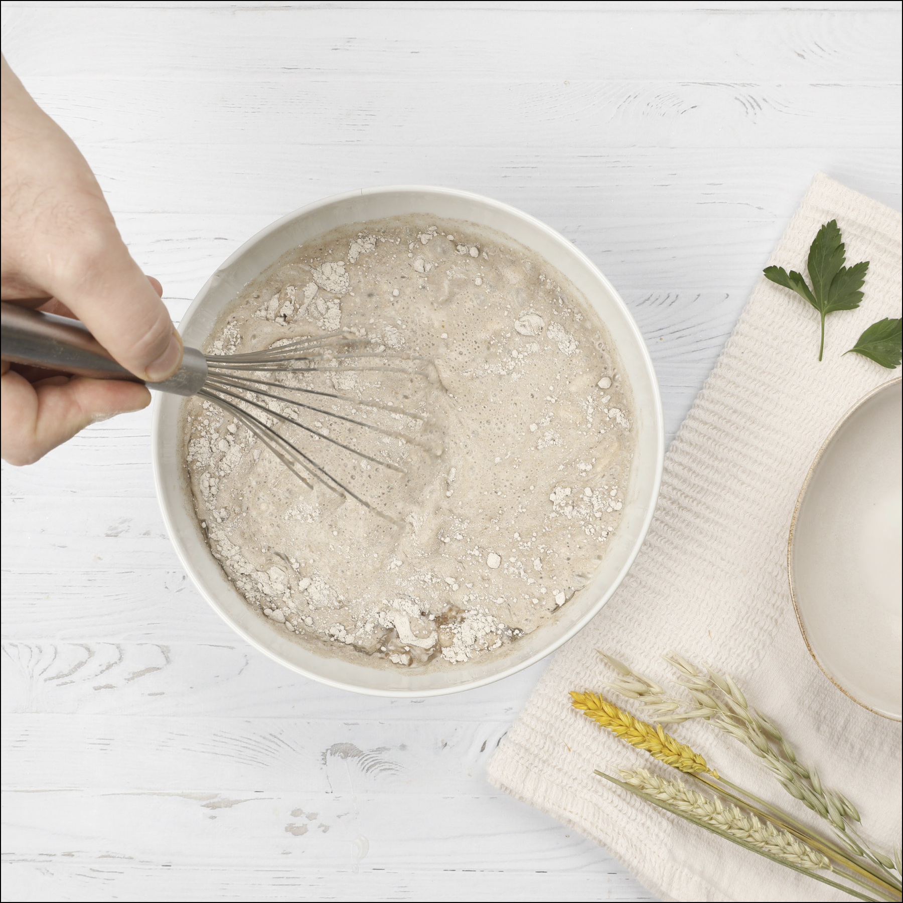 Verser 0,5 litre d’eau, 12,5 cl de lait demi-écrémé, 1 cuillère à soupe d’huile de tournesol puis mélanger jusqu’à avoir une pâte homogène. Laisser reposer 4 heures à température ambiante puis ajouter un peu d’eau si la pâte n’est pas assez consistante. Vous pouvez mixer la pâte si vous avez des grumeaux.